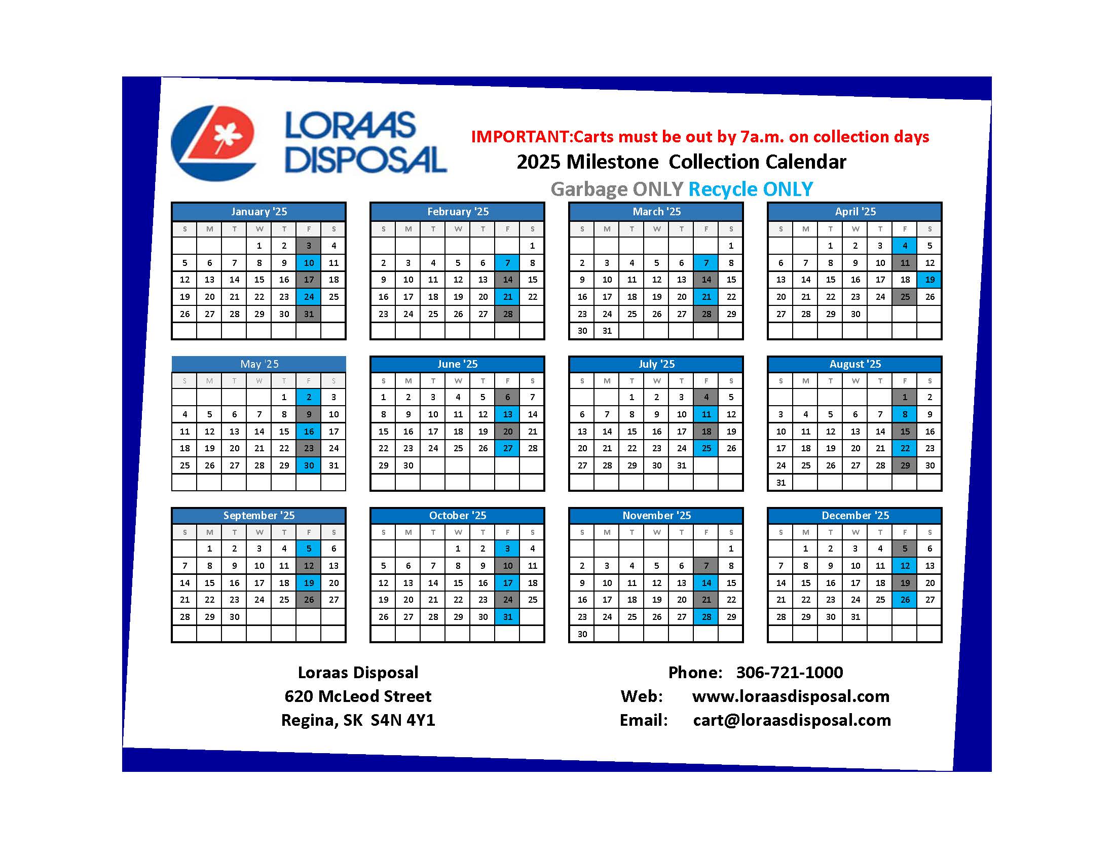 Garbage Pick-Up: Garbage pick-up is on the street (weather permitting). If collection cannot occur on a regular day due to weather or other reasons, Loraas will attempt to pick it up as soon as possible. Click here for the 2025 Loraas Collection Calendar.
