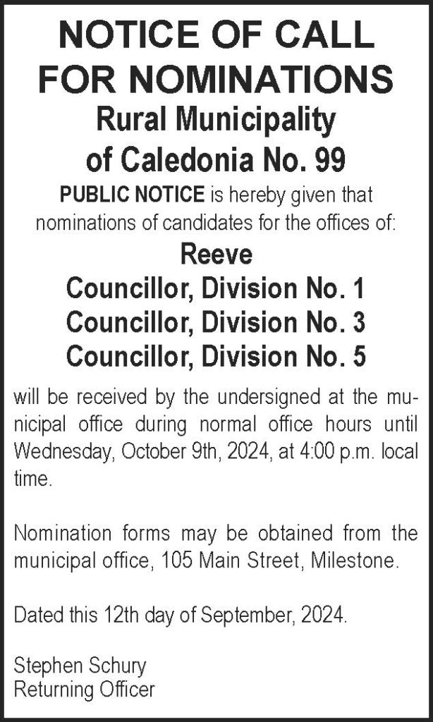The Rural Municipality of Caledonia No. 99 hereby gives public notice for nominations for the offices of Reeve, and Division 1, 3, and 5 councillors.